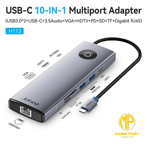 Bộ chuyển đổi Jasoz T-H113 USB-C 10 trong 1 Hỗ Trợ USB 3.0×3+HDMI+VGA +Audio 3.5mm +RJ45 + SD/TF +PD 100W