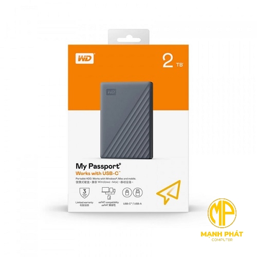Bộ sản phẩm: bao gồm 01 ổ cứng My Passport, 01 cable USB-A, 01 USB-C (có kèm bộ chuyển đổi)