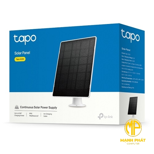 | Sản phẩm bao gồm | 1. Tấm pin mặt trời Tapo A202 ×1 2. Giá đỡ có thể điều chỉnh x1 3. Vít lắp x3 4. Chốt lắp x3 5. Miếng dán mẫu lắp x1 6. Gioăng chống thấm x6 7. Dây buộc cáp x1 8. Dây nối dài x1 9. Bộ chuyển đổi Type-C sang Micro USB x1 10. Bộ chuyển đổi Type-C sang Type-C x1 11. Hướng dẫn bắt đầu nhanh |