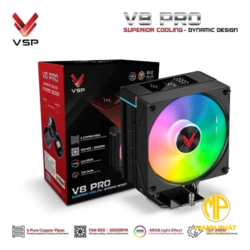 Tản Nhiệt Khí VSP V8 Pro Black (LED Monitor ARGB 4 Pipes 1 Fan 240W)
