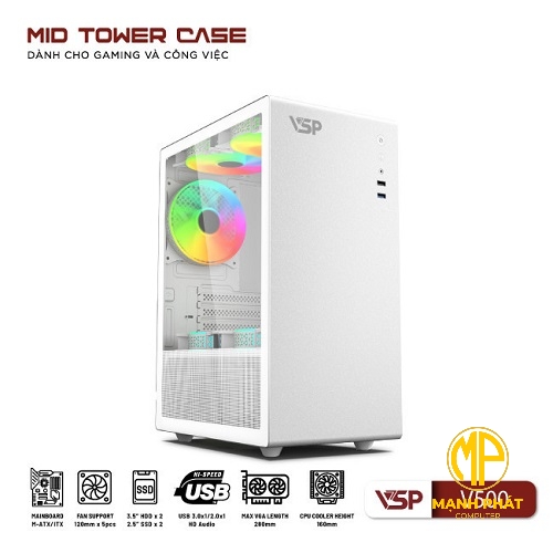 Vỏ Case máy tính VSP V500 Trắng (mATX USB 3.0 | SPCC 0.6mm | Nắp hông kính)