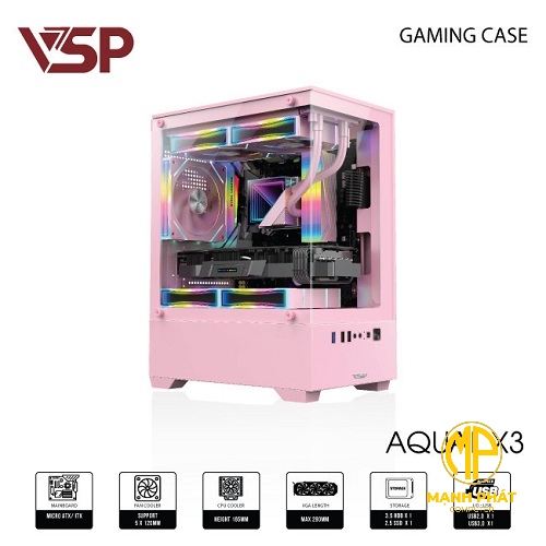 Vỏ Case VSP Aqual X3 Hồng (mATX USB 3.0 | Case 2 kính cường lực (Chưa fan))
