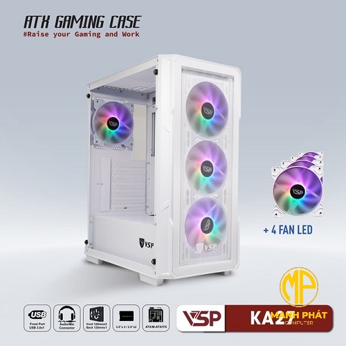 Vỏ Case VSP Gaming KA27 Trắng 4fans Led (ATX USB 3.0 | Có Sẵn 4Fan LED | Hai mặt kính)